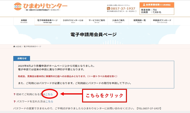 電子申請用へ進むためのログインボタン、各種申請の為のエクセル版フォームがあります。初回ご利用の場合のみ、赤丸をクリックして『会員ページ利用申請』を行って下さい。