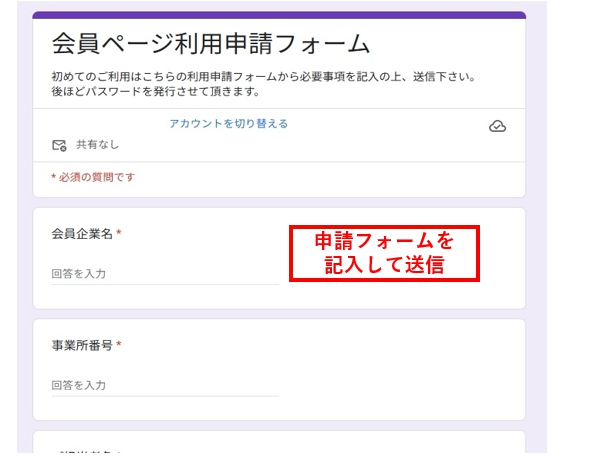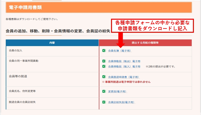 電子申請用会員ページの下部に各種申請フォームが設置されています。必要なエクセルファイルを一度ダウンロードして頂き、必要事項をご入力下さい。