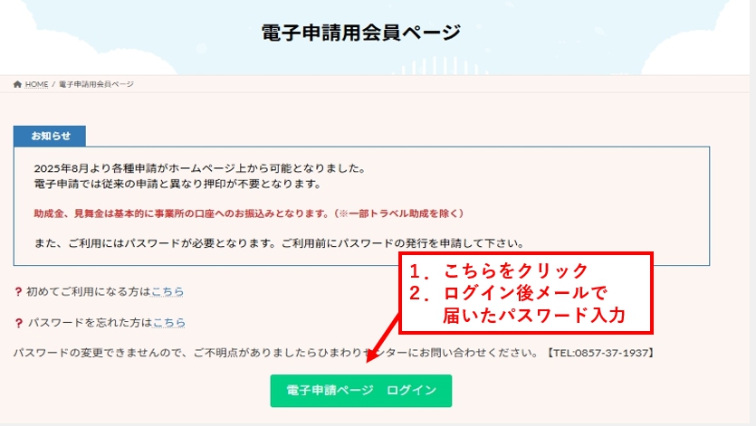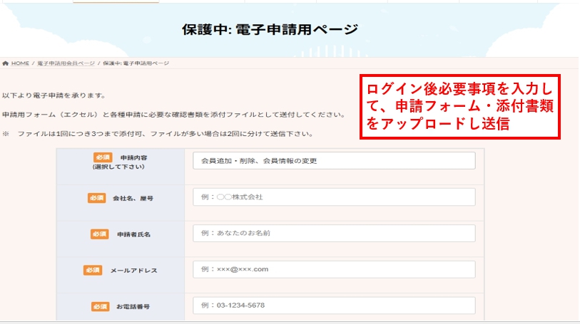 パスワードを入力頂くことで電子申請用ページへログインが可能となります。必要事項を入力の上、申請フォーム、添付書類をアップロードし送信ボタンを押してください。