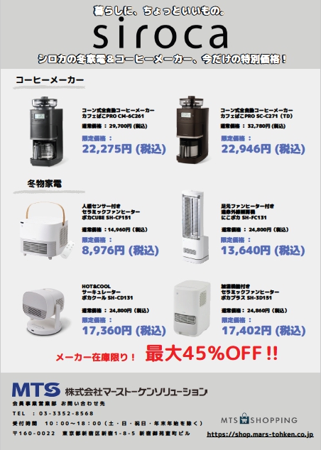 このたび社員販売通販サイト「MTSショッピングサイト」では、冬家電&コーヒーメーカーのシロカ特別価格販売が開始されます。