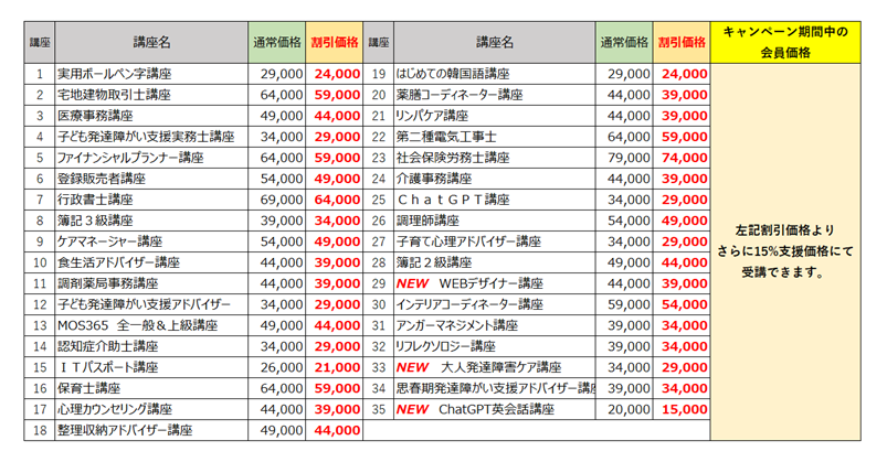 (例)医療事務 通常49,000円 ⇒キャンペーン価格44,000円 ⇒ さらに15%オフ⇒会員価格37,400円